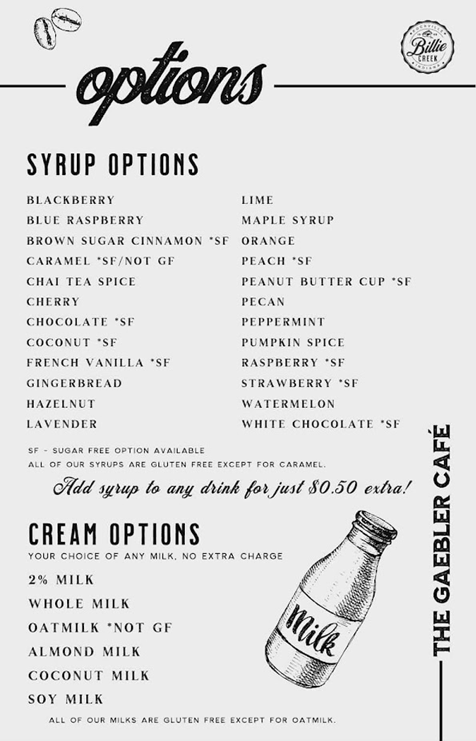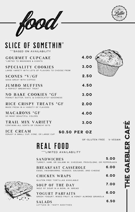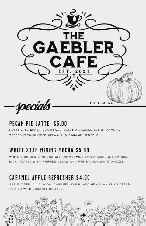 Step into The Gaebler Café, where classic comfort food and warm hospitality come together in a cozy, historic setting. Whether you’re stopping in for a fresh-baked treat or just a cup of coffee, you’ll find a welcoming spot to relax and refuel. Nestled in the heart of Billie Creek, our café is the perfect place to savor simple, homemade goodness.
